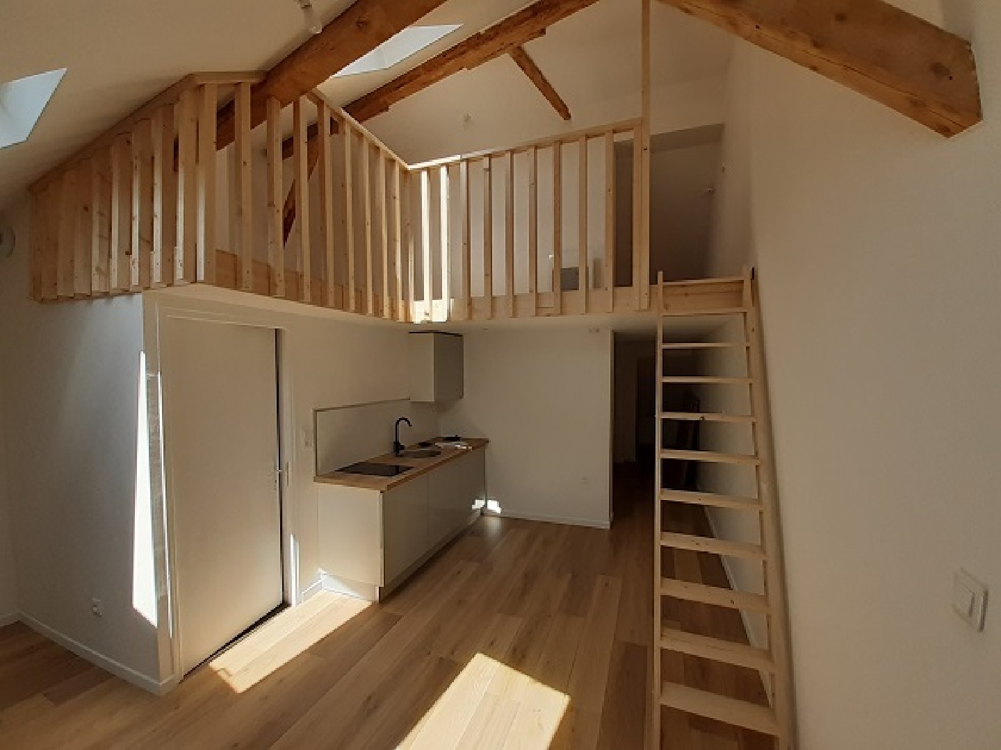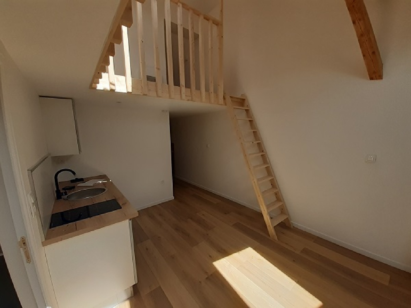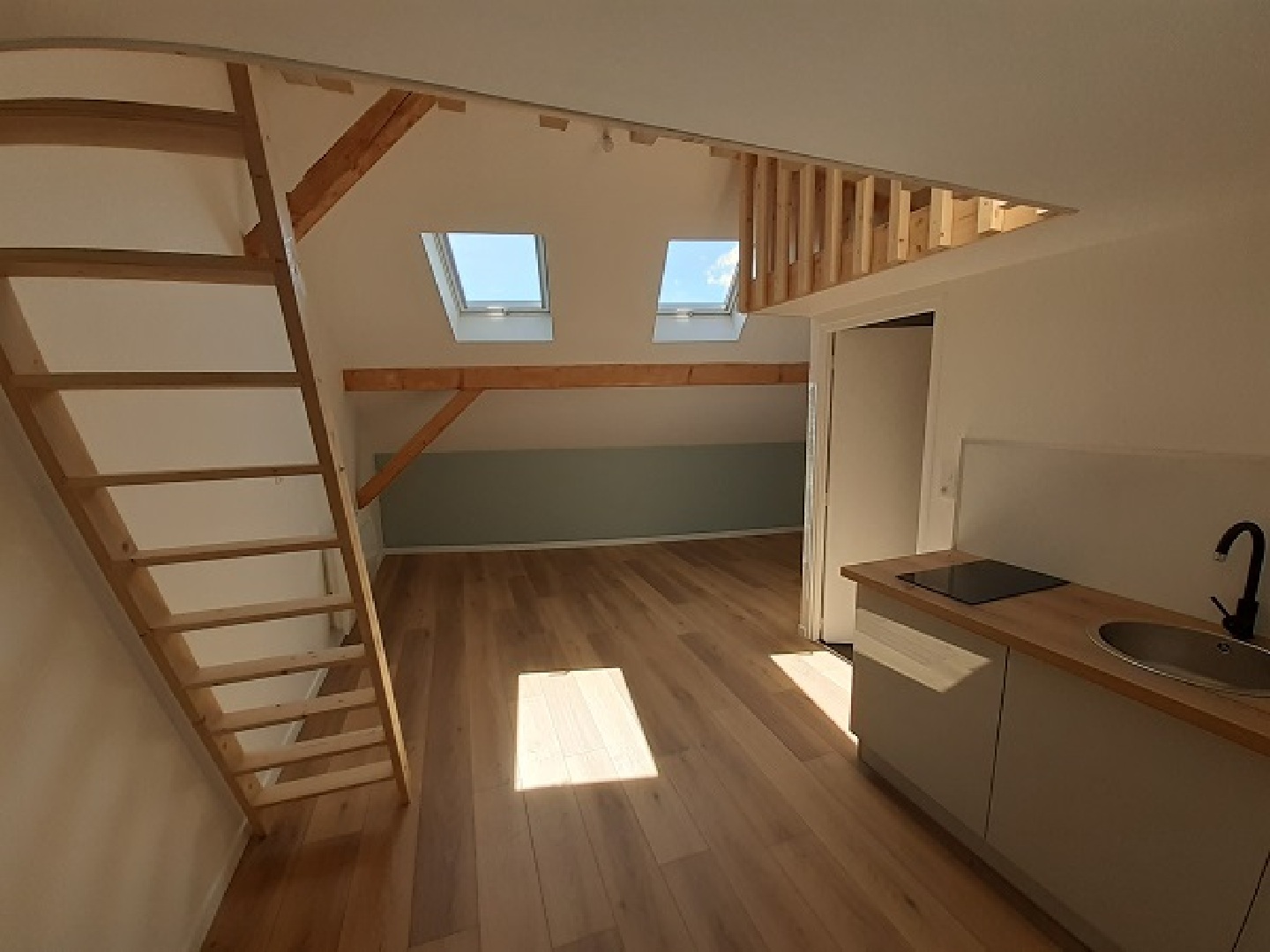 Appartement rénové de type F1 BIS comprenant : un hall d'entrée, une cuisine équipée ouverte sur salon/séjour, une salle d'eau avec WC, à l'étage une chambre.